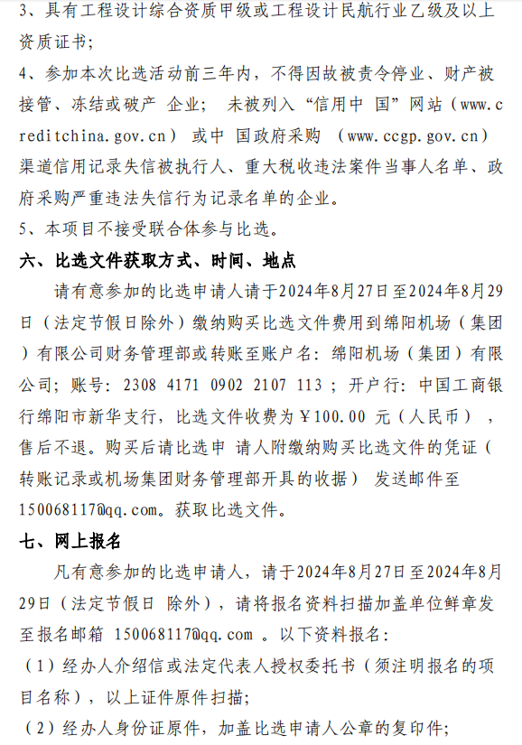 綿陽機場 T1、T2 航站樓連接通道改造項目設(shè)計單位(第二次)比選公告